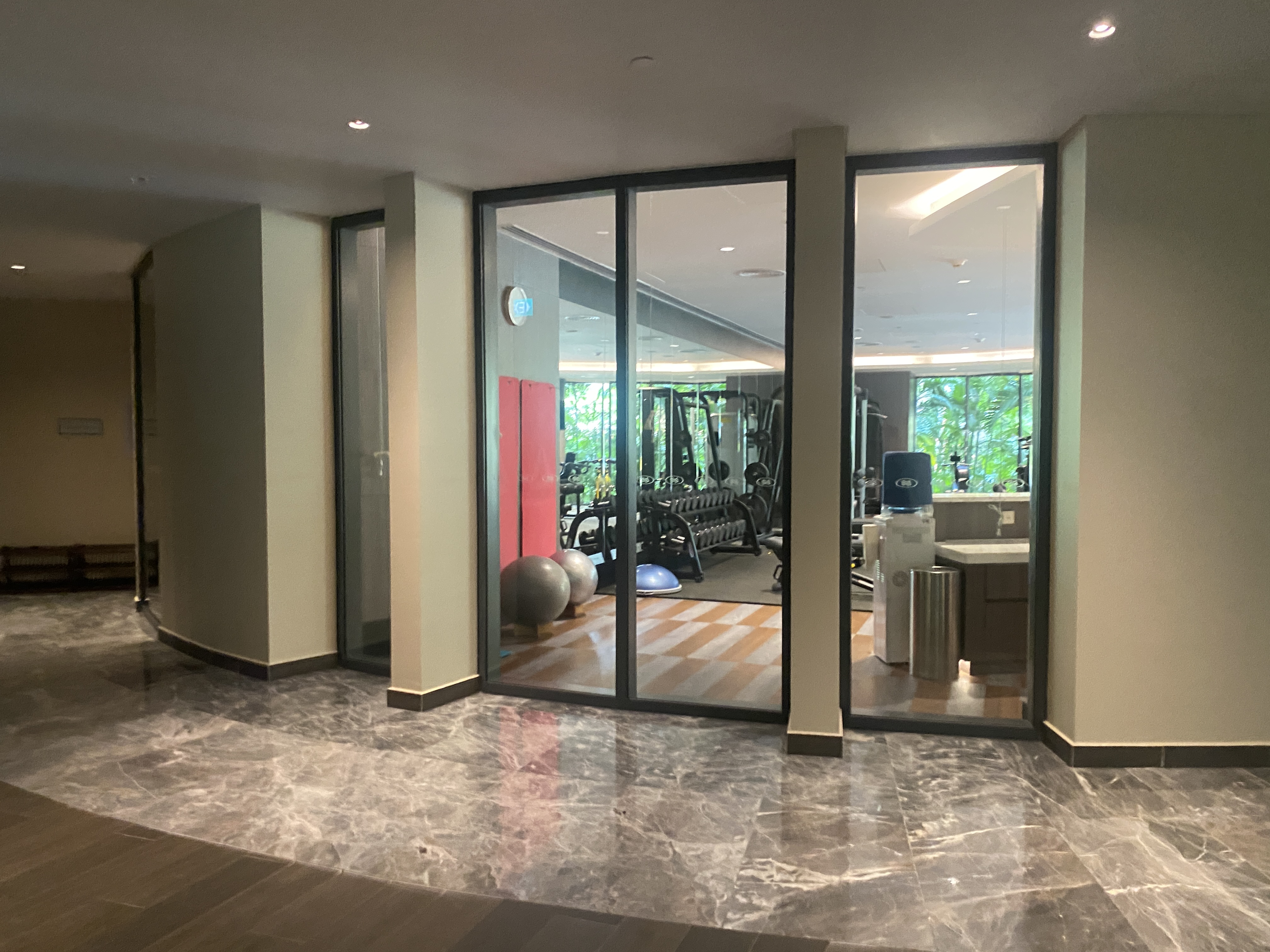 로비 가운데 있는 계단으로 내려가보면 1층이 나오는데요 수영장가는길, 맛사지샵, 키즈룸, 게임룸, 유아야외놀이터, 피트니스센터, 비즈니스회의장 이 있습니다
